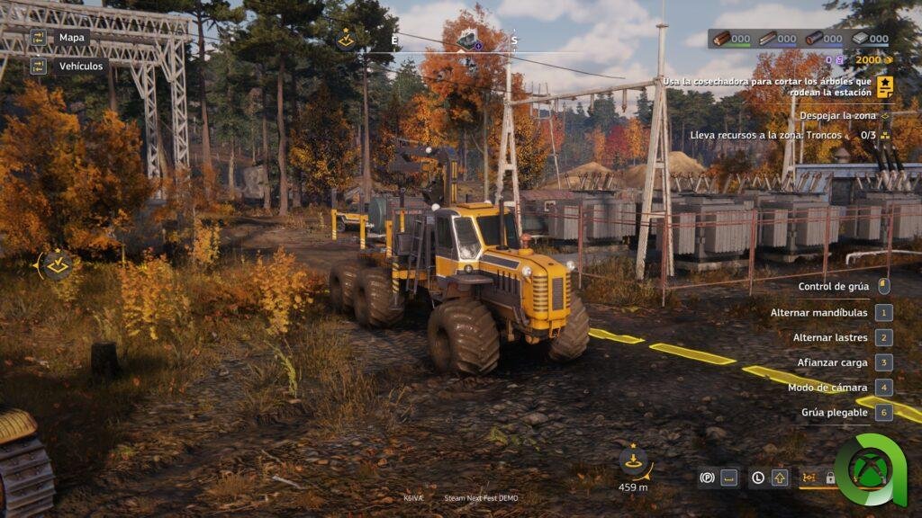 En la demo se proponen varios retos, como despejar zonas boscosas, trasladar troncos o tender cables de energía. Si bien la acción de cortar se activa de forma automática al acercarte, la verdadera dificultad radica en sincronizar la recogida de la madera utilizando una garra junto con un sistema de rotación que a veces invierte intuitivamente las direcciones. Del mismo modo, el manejo del cargador frontal tiene sus peculiaridades, exigiendo que estemos muy pendientes de lo que hacemos.