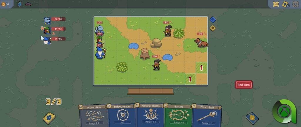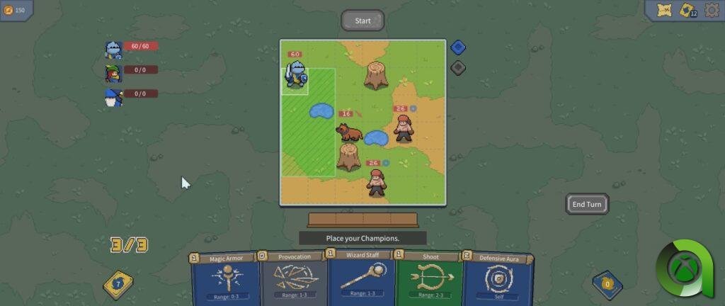 En primer lugar, deberemos situar a nuestros personajes en la zona verde del tablero, algo más importante de lo que parece ya que hay casillas que nos aportarán beneficios de armadura, como la hierba, o nos harán más vulnerables, como los charcos. En cada turno podremos movernos un determinado número de veces con cada uno.