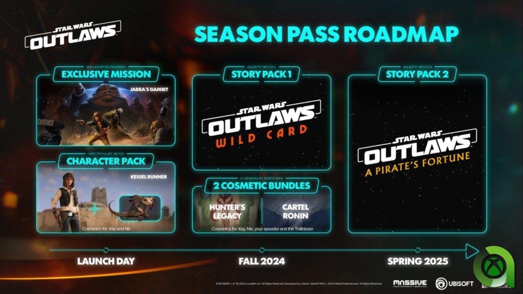 Con el lanzamiento de Star Wars Outlaws a la vuelta de la esquina, Ubisoft ha aprovechado este momento para revelar la hoja de ruta del pase de temporada -«Season Pass»- del que dispondrá su título estrella de La Guerra de las Galaxias. Para empezar, de lanzamiento este pase de DLCs nos dará acceso a una misión exclusiva bajo el título de «El Gambito de Jabba«, que por supuesto contará una historia relacionada con Jabba el Hutt. Continuando con una serie de cosméticos que nos permitirán transformar las prendas de Kay Vess, la protagonista, en las de Han Solo, entre otros.