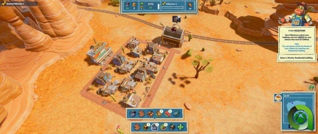 La jugabilidad es sencilla, construimos donde tengamos hueco y conectamos los edificios con caminos. Lo primero que necesitamos es construir viviendas para nuestros robots. Cada una tiene sus necesidades, como acceso a un mecánico y demás, que deberemos cumplir construyendo dichos edificios.