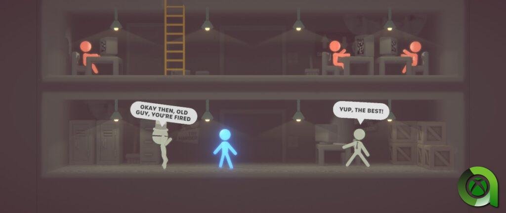 Nada más levantarnos de la silla, nuestros compañeros y demás trabajadores nos atacarán, gritarán que estamos despedidos y demás improperios, a lo que deberemos responder con violencia. Decir que el movimiento del personaje es muy fluido y tiene un toque de ragdoll, lo típico que pareces estar hecho como de plastilina y el movimiento es algo exagerado, aunque aquí está muy bien medido y es casi que únicamente algo visual.