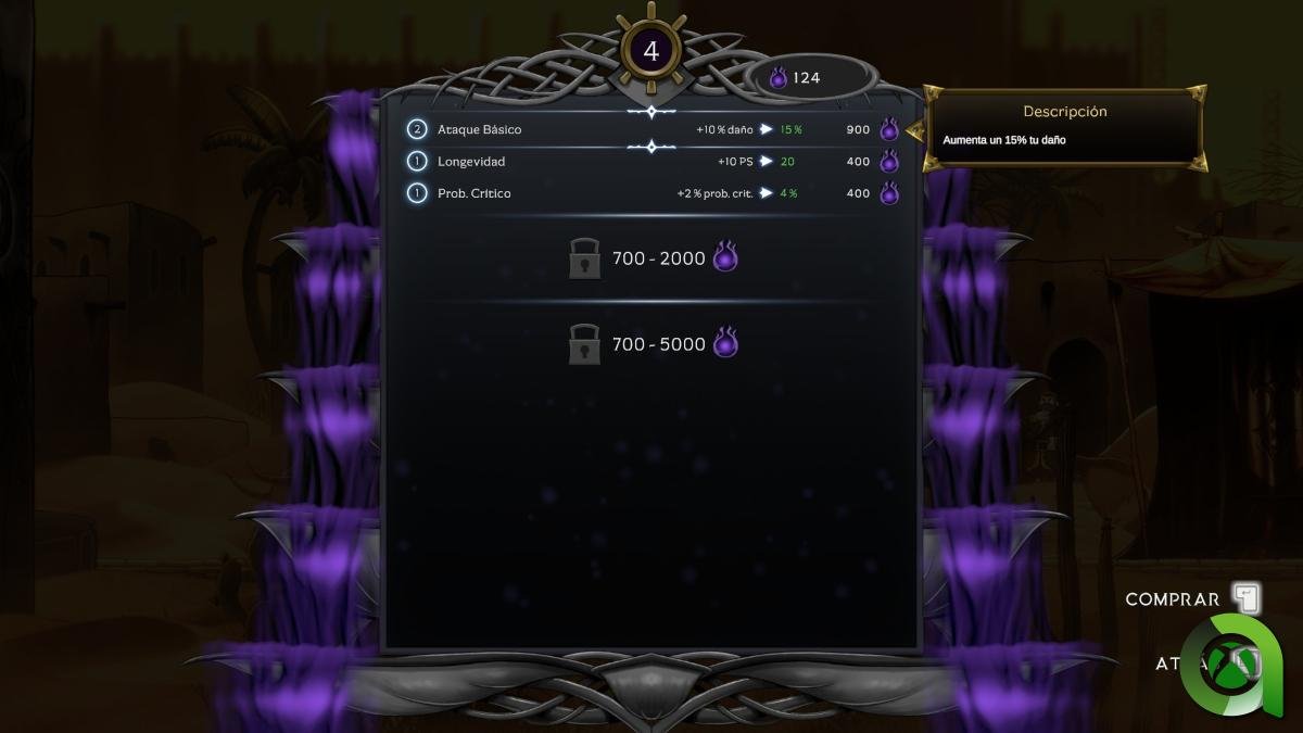 Para mejorar a nuestro personaje tendremos que hacer uso de la fuente de poder, cada mejora tendrá un coste en maestría oscura.
