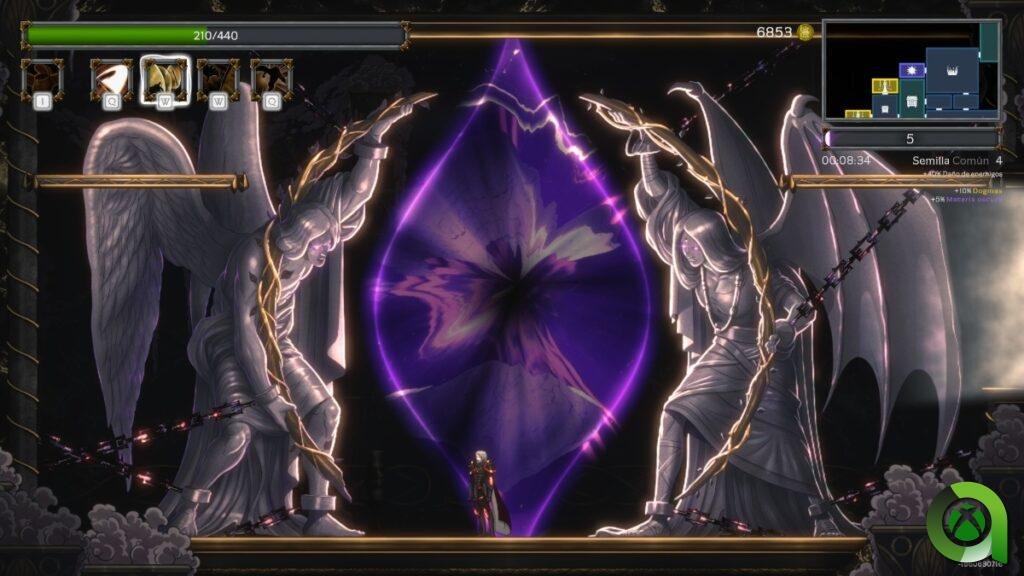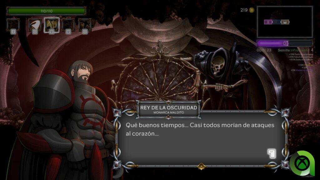 Otra muy interesante es la de la ruleta de la muerte, donde girar la ruleta implica adquirir un estado negativo y otro positivo. Para deshacernos del negativo tendremos que realizar ciertas acciones, como abrir 1 cofre o eliminar a x enemigos. Una vez completada la condición, el efecto negativo desaparecerá mientras que el positivo lo mantendremos. También podemos mantener conversaciones con la muerte que suelen ser bastante interesantes, incluso hay una referencia a Death Note.