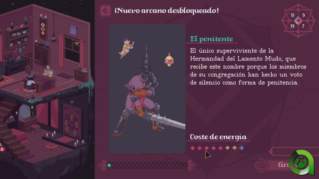 Nuestro poder se basa en la adivinación, Fortuna es una bruja oráculo, por lo que usamos las cartas del tarot para ver el futuro y así ayudar a la gente. Ábramar nos permite diseñar nuestras propias cartas, con arcanos muy diferente a los clásicos. Para diseñar las cartas debemos tener en cuenta varias cosas, lo primero es la energía, dividida en aire, agua, tierra y fuego, cada una asociada a unos significados. Las energías no son infinitas sino que iremos ganando puntos a través de la lectura, soñando o de echar las cartas a las demás brujas que nos visiten. Con la energía necesaria, seremos nosotros quien las diseñemos, eligiendo los arcanos, símbolos y esferas, como si de capas de Photoshop se trataran. Decir que los diseños disponibles pueden aumentar según nuestras acciones, todas son bastante llamativas e incluso vemos algún que otro cameo, como el Penitente, de Blasphemous.