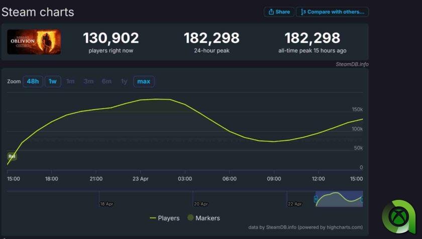 Se acabaron los rumores. Bethesda rompió el silencio en el evento de ayer, anunciando que ya podemos disfrutar de la remasterización de The Elder Scrolls IV: Oblivion. Muchos usuarios guardan en su corazón grandes momentos jugando a esta entrega y ha sido sorprendente ver que en Steam se ha alcanzado (en el momento en que se ha redactado esta noticia) la cantidad de 182.298 jugadores conectados simultáneamente.