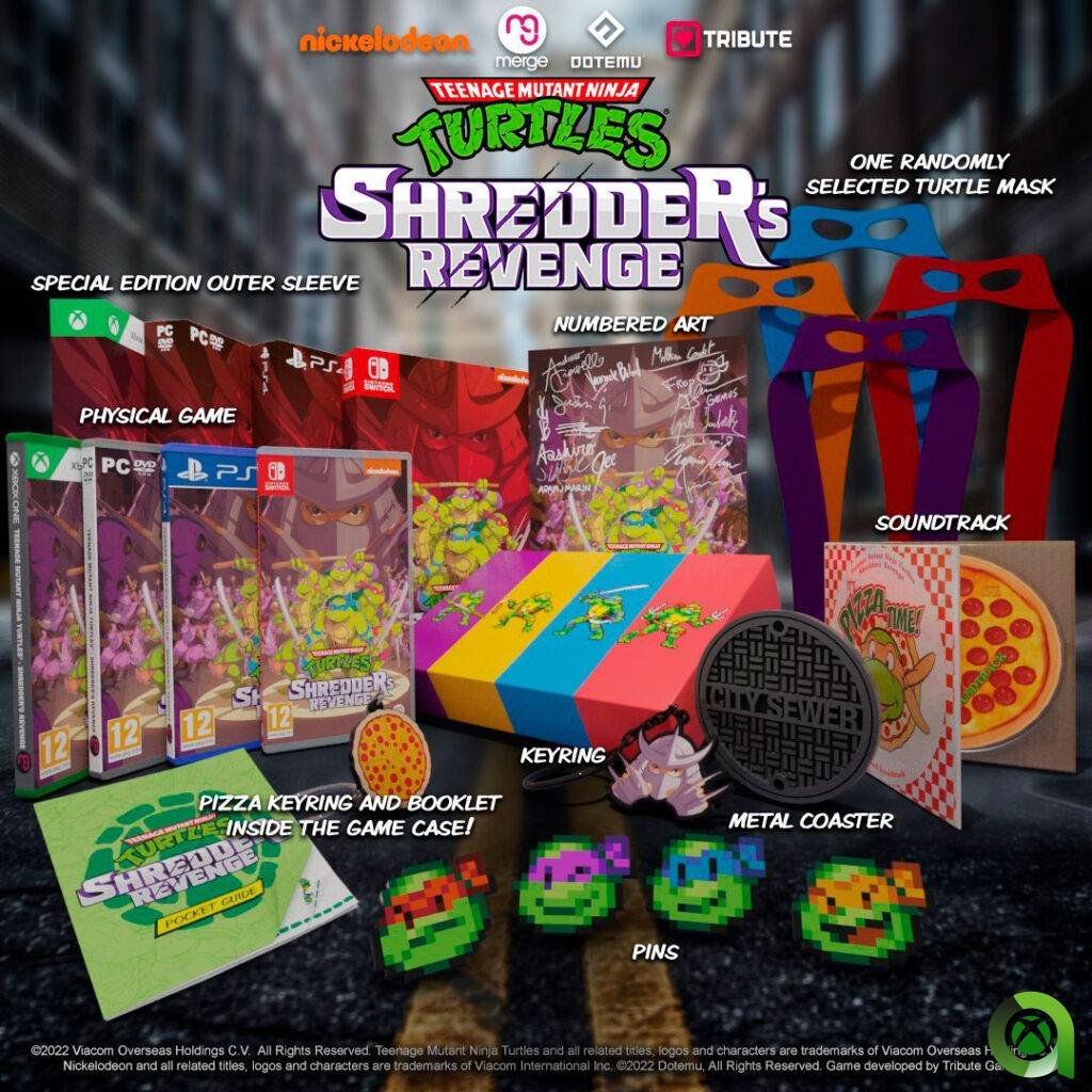 - La Edición Signature incluye: Copia física de Teenage Mutant Ninja Turtles: Shredder’s Revenge (incluye un manual y un llavero pizza). Set de cuatro pins con diseño exclusivo de Leonardo, Raphael, Donatello y Michelangelo. Certificado numerado coleccionista firmado por el estudio de desarrollo. Antifaz de las tortugas ninja con un modelo aleatorio, ¿Cuál te tocará; el antifaz azul de Leonardo, el rojo de Raphael, el morado de Donatello o el antifaz naranja de Michelangelo?. CD con la banda sonora original. Llavero metálico de Shredder con el artwork oficial del juego. Caja coleccionista con el diseño en pixel de Leonardo, Raphael, Donatello y Michelangelo.
