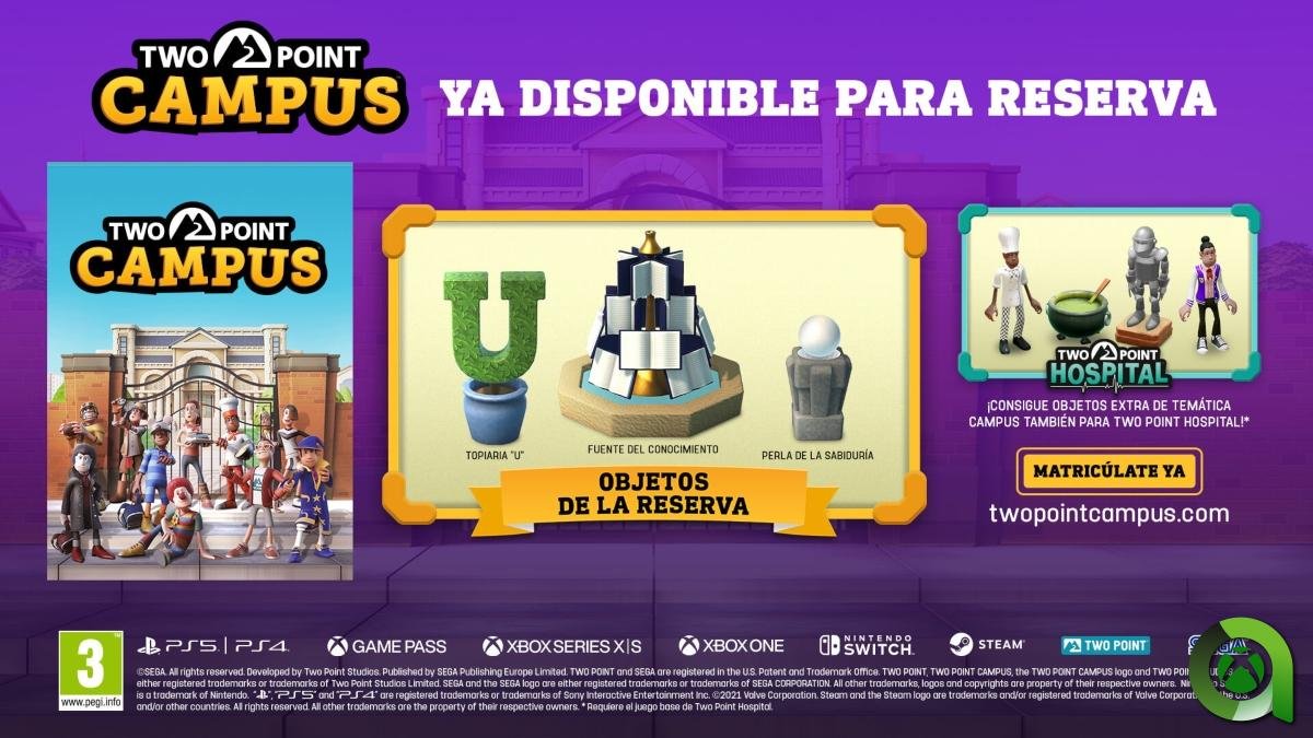 Para obtener más información sobre Two Point Campus visita www.twopointcampus.com. Puedes inscribirte hoy mismo en el County Pass, que desbloquea el objeto gratuito más codiciado del juego en su lanzamiento: «El retrete dorado». Los propietarios de Two Point Hospital que reserven una copia física de Two Point Campus recibirán los objetos gratuitos del juego cuando Two Point Campus se lance el 17 de mayo de 2022. Los propietarios de Hospital que precompren Campus en formato digital para Steam, Xbox o PlayStation podrán reclamar sus objetos gratuitos de inmediato. Sigue todas las novedades de Two Point Campus en Área Xbox.