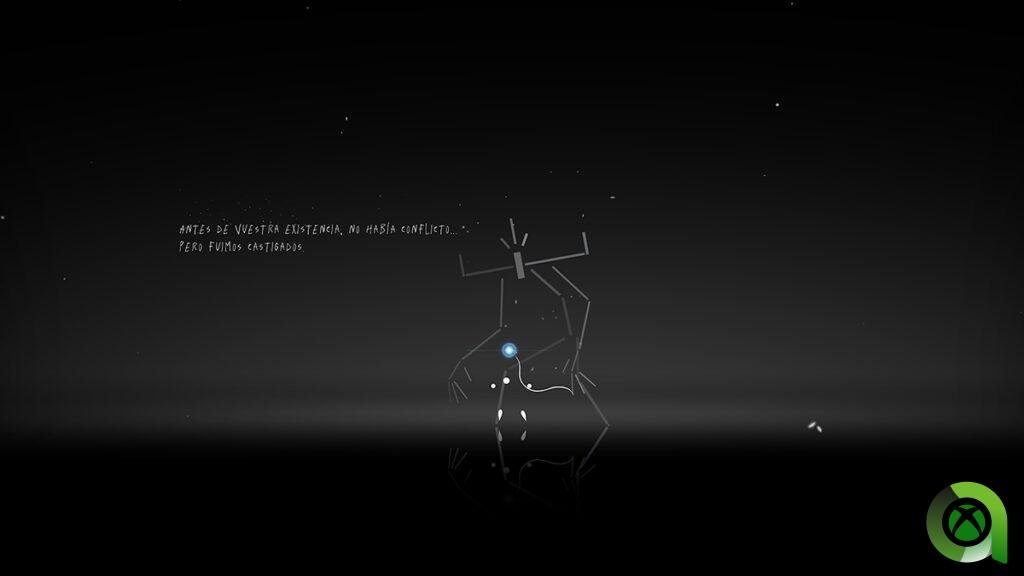 El mapa de este mundo vacío es inmenso y al recorrerlo, entre sus diferentes secciones, nos encontraremos unos seres con forma humanoide que nos dirán frases sueltas. Esto será lo que nos vaya contando la historia, que está bastante de fondo. Como de fondo también tenemos la otra forma de entender el mundo en el que vivimos. En el segundo plano de los escenarios podremos ver pequeñas escenas que muestran este combate eterno y también seres de color verde, que serán clave para entender la situación en la que estamos.