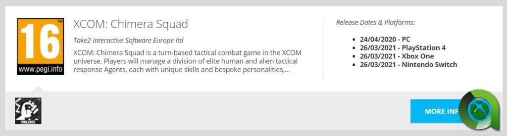 No ha habido noticias oficiales sobre el  lanzamiento de Chimera Squad  para plataformas adicionales por parte de los desarrolladores o del editor, pero sí se ha producido un peculiar movimiento que parece indicar que esto se producirá más pronto que tarde. XCOM: Chimera Squad  ha recibido una clasificación de edad para Xbox One, PS4 y Nintendo Switch de Pan European Game Information (o PEGI), la junta de clasificación europea. Tras esto (y con suerte) es de suponer que la calificación PEGI significaria que un anuncio del título para las mencionadas consolas sería inminente.