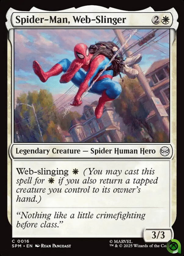 Siguiendo esta línea, encontramos una nueva mecánica que formará parte del color blanco. Denominada en inglés Web-slingin, es una habilidad similar a Ninjutsu pero con un caracter más defensivo. En este caso, podemos pagar un coste reducido como por ejemplo un maná blanco, para jugar a la criatura, eso sí, tendremos que devolvernos una criatura girada a nuestra mano. Es un efecto que puede ser interesante para poder proteger a alguna criatura que sea objeto de un conjuro o habilidad enemigo. O bien para poder hacer algún efecto de bounce.