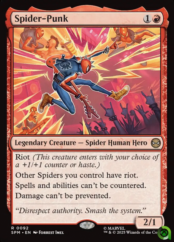 Por otro lado, con respecto al color negro, he observado que muchas de sus criaturas vuelven a recuperar Toque Mortal. Esta poderosa habilidad que suele limitar mucho a mazos agresivos, siendo una gran amenaza para muchos mazos. En el caso del mazo rojo que hemos podido probar, mantiene la esencia del color siendo terriblemente agresivo y contando con una de las cartas más interesantes de todo el set, que viene a potenciar aún más a los mazos Izzet. Spider-Punk es una carta extremadamente poderosa que por 2 manás hace prácticamente de todo. Aunque lo más interesante es que los conjuros y habilidades no pueden ser contrarrestadas. Eso sí, no sólo las del jugador que lo controle, sino que afectará a toda la mesa. Un arma de doble filo en mesas de Commander.